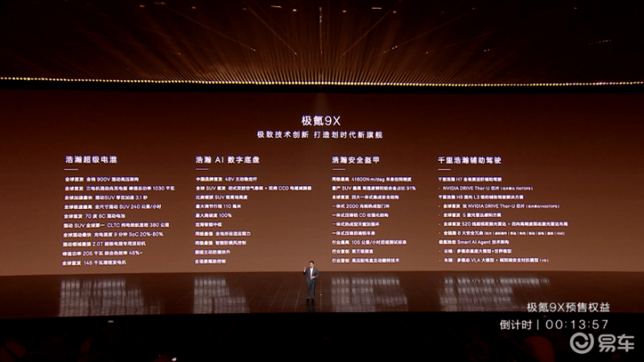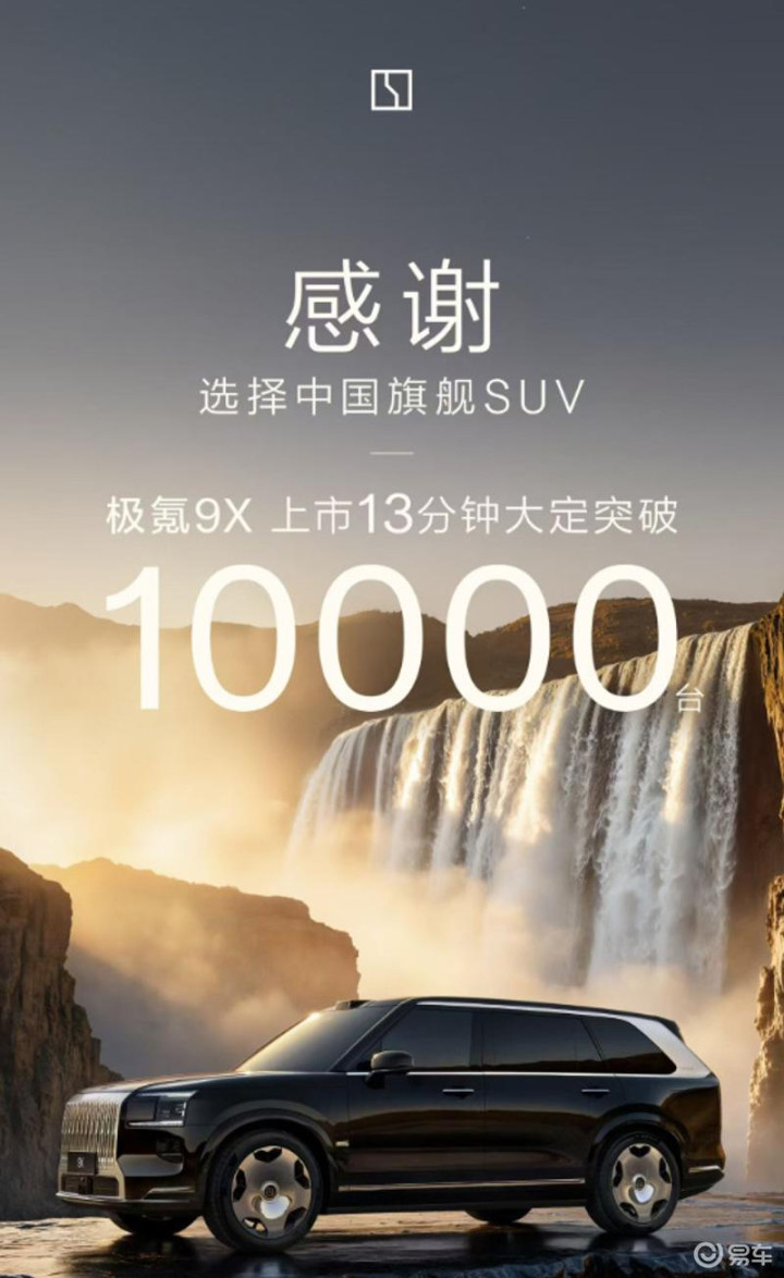 易车讯9月29日,极氪9X正式上市,推出4款车型,官方指导价区间46.59-59.99万元,超级置换权益后限时售45.59-58.99万元。官方数据显示,新车上市仅13分钟大定就突破1万台。极氪表示,9X的甄选车型将于明日开启交付,Hyper版则计划在11月下旬开启交付。